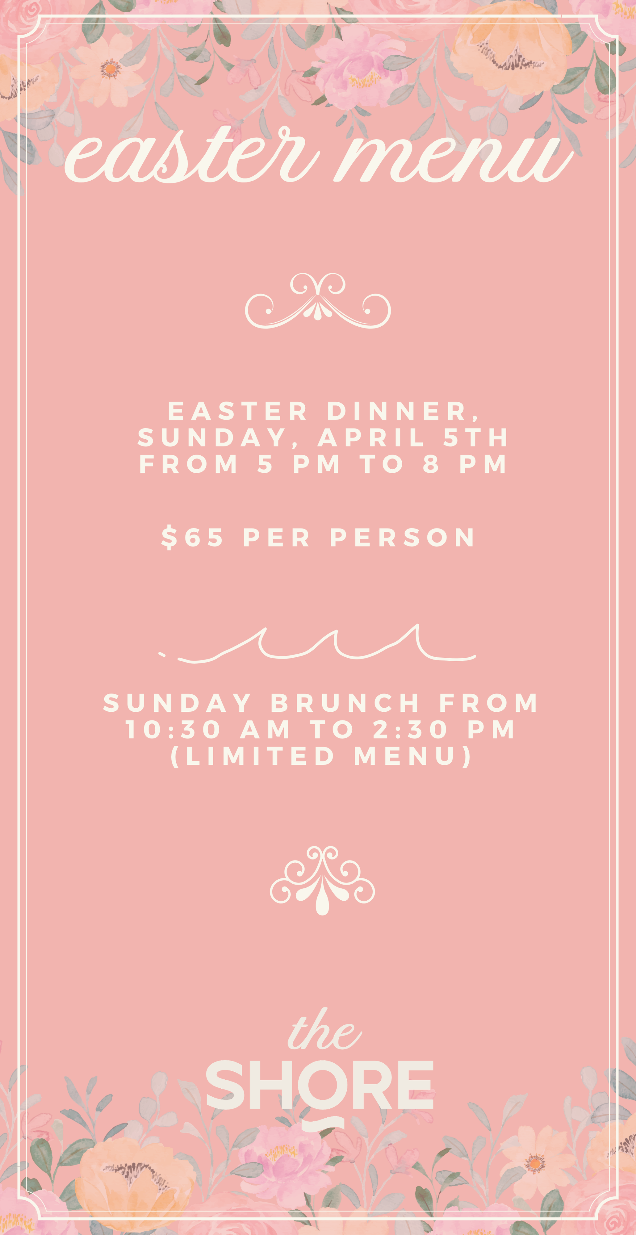 Our typical Sunday Brunch (with limited menu) will also be available on April 5th from 10:30 A.M. to 2:30 P.M. Reservations will require a deposit to your reserve spot due to high-volume. And the regular dinner menu will not be available during Easter Dinner.